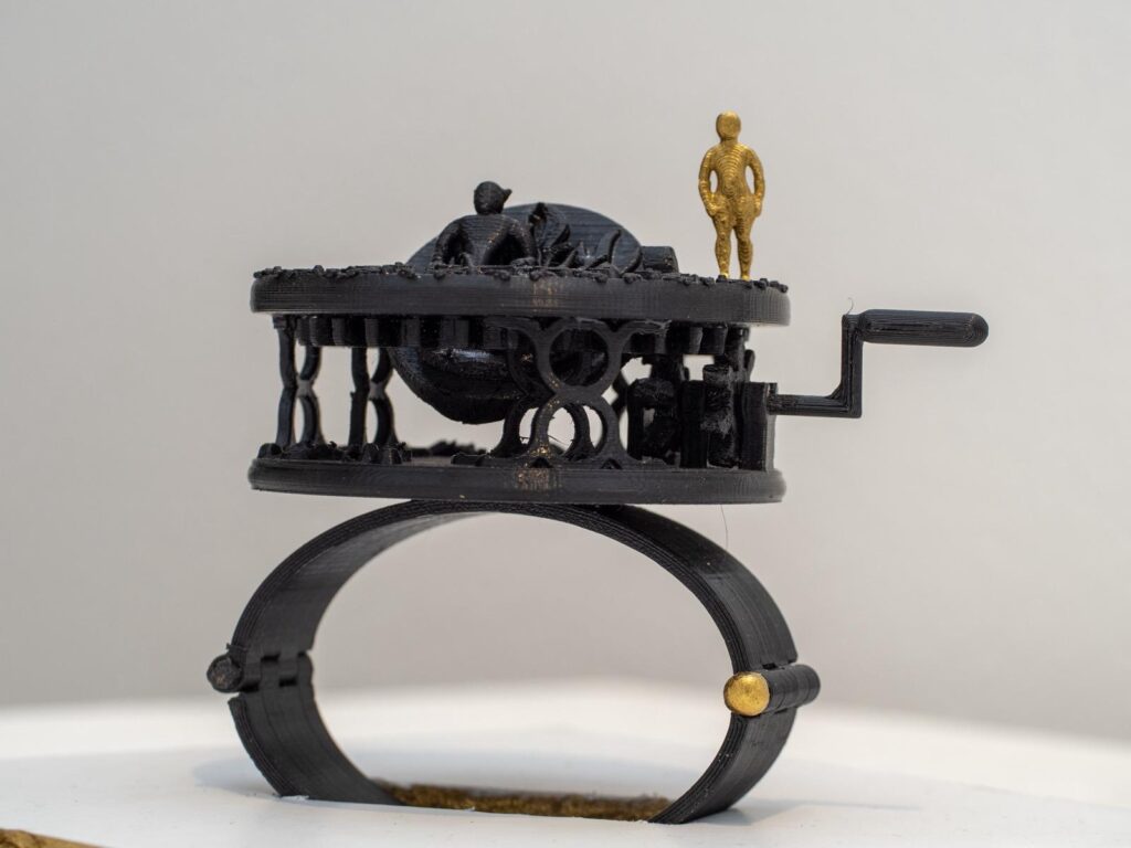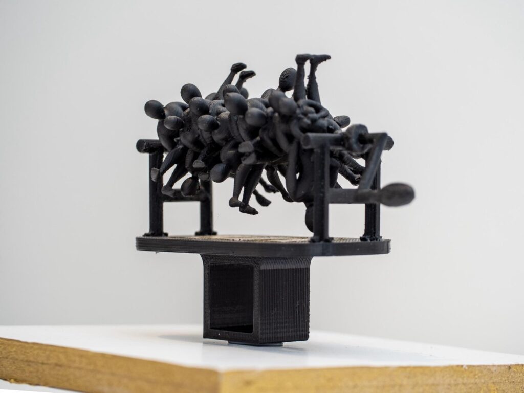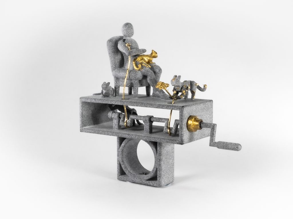 יעל פרידמן, "האיש והחתולים" הדפסת תלת מימד,צבע אקרילי, חוטי מתכת, צילום: ניר פרידמן
